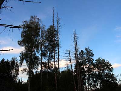 Schon hier sehe ich vereinzelt abgestorbene Nadelbaeume (wg. Borkenkaefer).