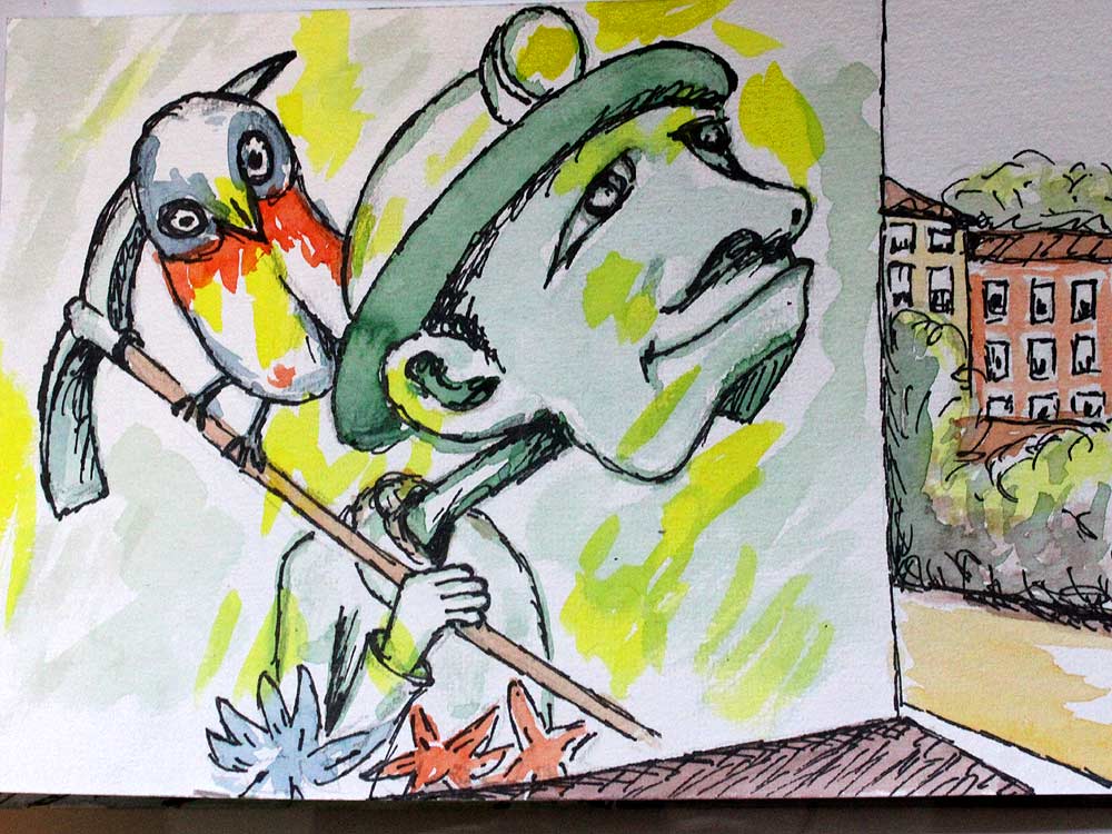Stattdessen versuche ich, ausgewaehlte Motive mit Aquarellfarben und Fineliner umzusetzen. Das konnte ich doch mal gut. Oft ist da aber das Gefuehl, einen Knueppel statt eines Pinsels in der Hand zu haben.